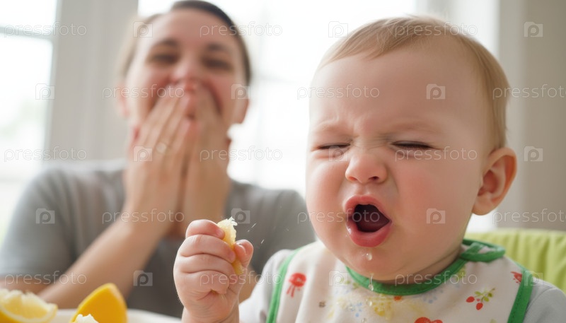 Маленький ребенок делает смешное, кислое лицо после того, как попробовал кусок свежего лимона, в то время как их мать смеется на размытом фоне