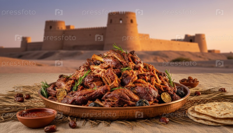 Традиционное блюдо жареного ягненка подается рядом с древней пустынной крепостью, подчеркивая культурное наследие региональной кухни, туристическую привлекательность пустыни и традиции гостеприимства