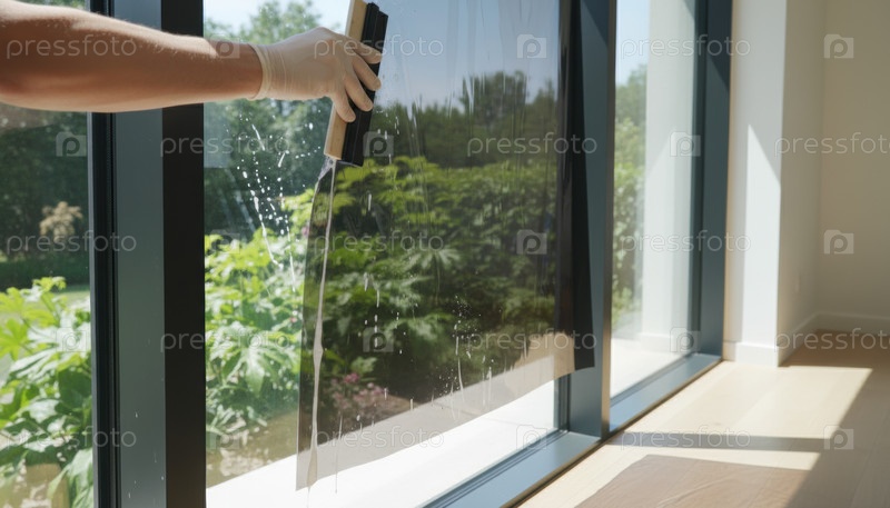 Установка оконной пленки, иллюстрирующей тенденцию улучшения энергоэффективности дома, устойчивого образа жизни и современную концепцию жилищного благоустройства