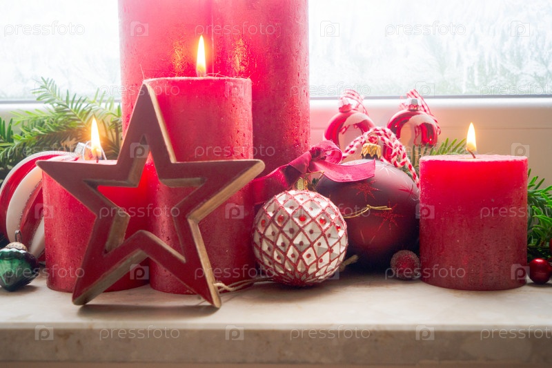 Красные горящие приключенческие свечи с рождественскими украшениями на буксире