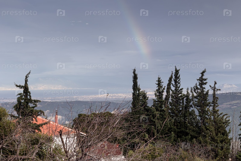 Прекрасный вид на горы, радугу и деревню (Греция, Пелопоннес)