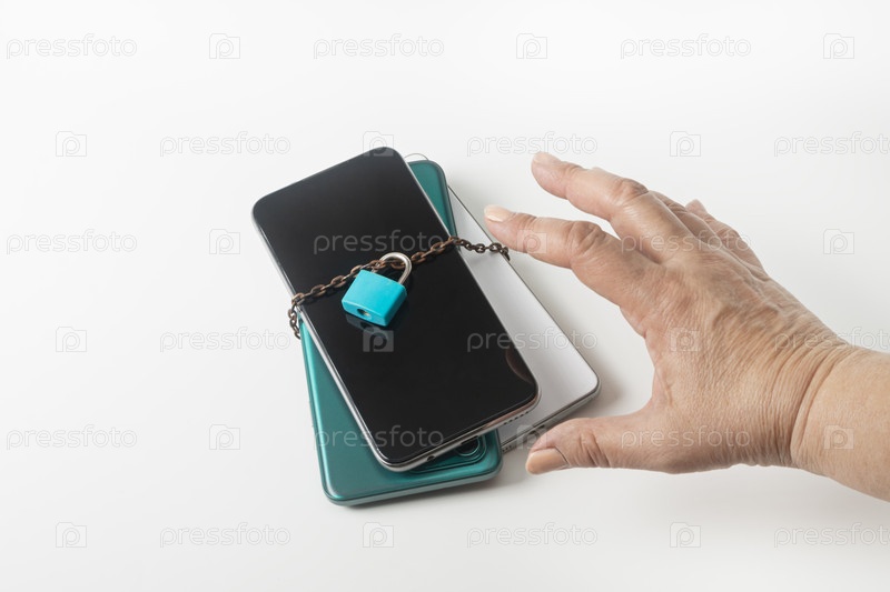 Рука тянется к стопке мобильных телефонов, прикованных и запертых. Информационная перегрузка, цифровая усталость, цифровая детоксикация. Цифровая зависимость
