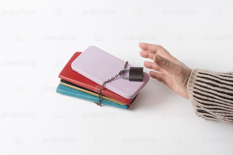Рука тянется за стопкой мобильных телефонов, закованных в цепи и заблокированных