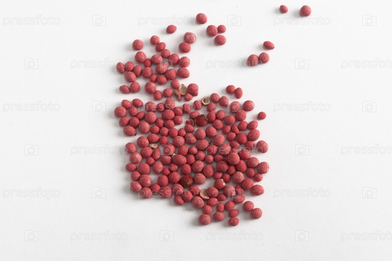 Куча семян красной моркови на белом фоне, изолированная. плоская. макро