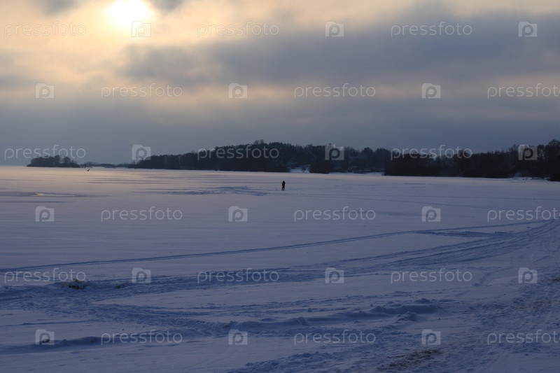 Одинокий рыбак ловит рыбу на озере Ильмен возле Великого Новгорода в зимний вечер