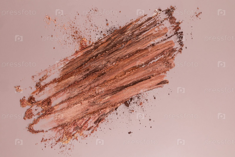 Порывы измельченной текстуры тени для глаз в коричневых, бежевых и золотых цветах на бежевом фоне. макеты для рекламы декоративных косметических изделий, продуктов