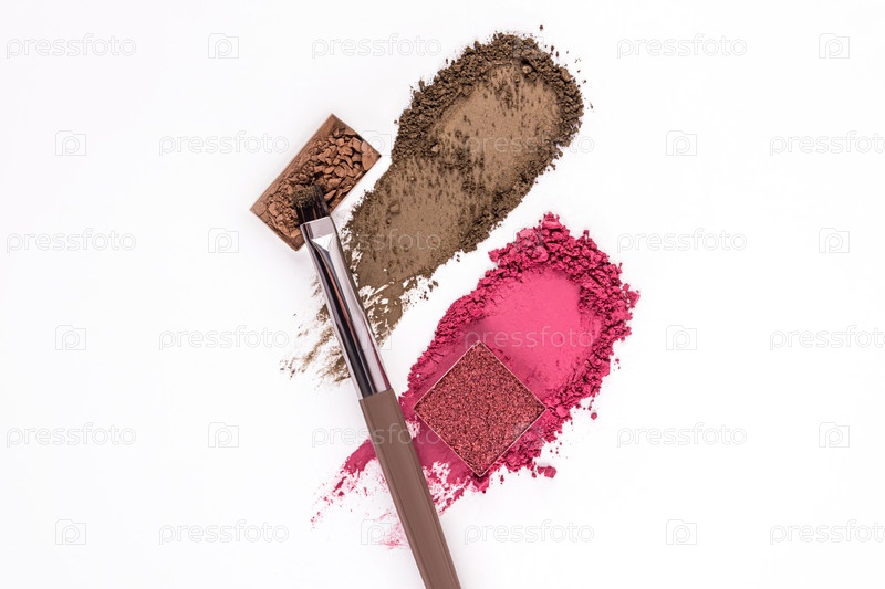 Два косметических образца текстуры теней для глаз в розовом и коричневом цветах на белом фоне с заполнением карими тенями и профессиональной косметикой