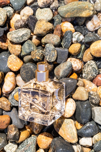 Близкий план прозрачной, квадратной бутылки с парфюмом на фоне гальки пляжа. пустая компоновка бутылок. презентация морской аромат