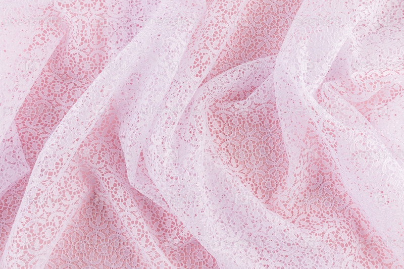 На фоне изображение хаотических волн открытой белой ткани с цветочными орнаментами. Абстрактный фон белой гипуры. Деликатная текстура складки