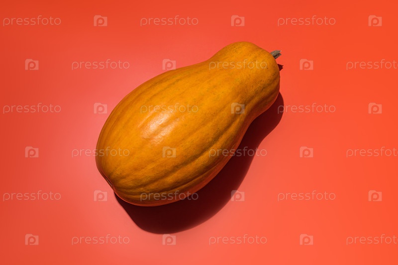 Большой длинный плод апельсиновой тыквы на оранжевом фоне. Вид сверху. Копировальное пространство. Твёрдые тени тыквы. Концепция осеннего урожая