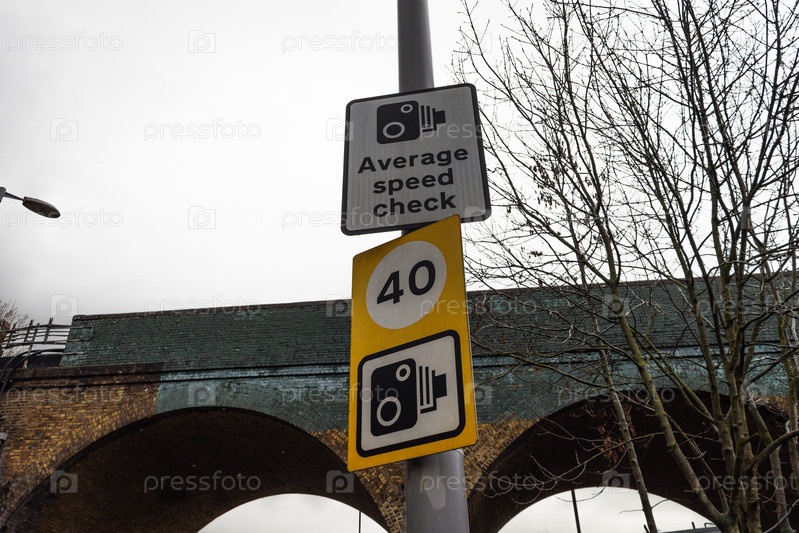 Проверка средней скорости и знаки ограничения скорости 40 миль в час, установленные на столбе против облачного неба и кирпичного железнодорожного моста в Великобритании
