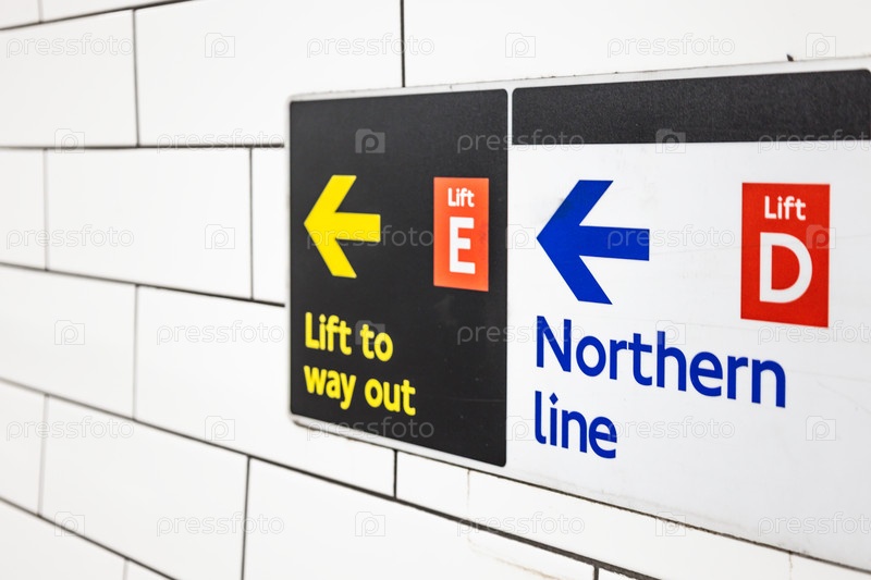 Направления на лондонском метро показывают путь к северной линии и лифту, чтобы выйти из стены с белыми плитками