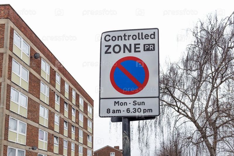 Белый знак ограничения парковки контролируемой зоны на металлическом столбе с символом ожидания и временными ограничениями, установленный на кирпичном жилом здании
