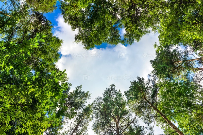Лесное дерево на вершине неба зеленые сосны и березы летом более низкий угол съемки