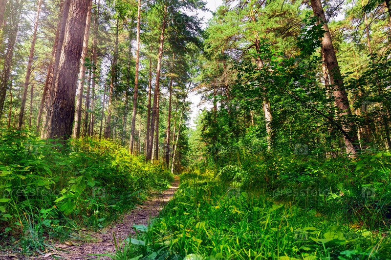 Солнечное утро в сосновом лесу. Красочный пейзаж. Путь к лесному парку