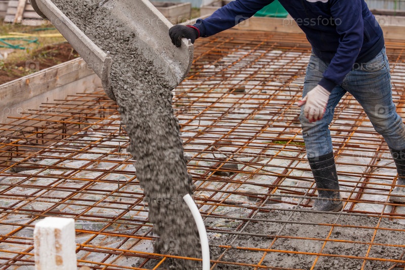 Ближайший снимок литья бетона на укрепляющих металлических подольных стержнях на промышленной строительной площадке