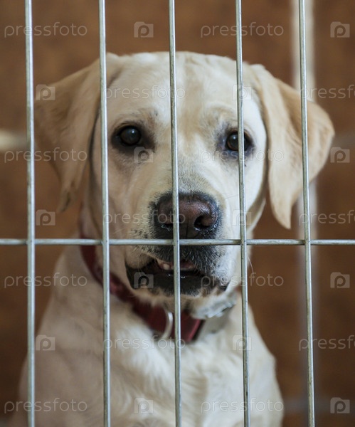 Любящий лабрадор ретривер смотрит через сетку клетки