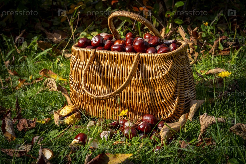 Кошачий корзинка, наполненная блестящими каштанами на зеленой траве