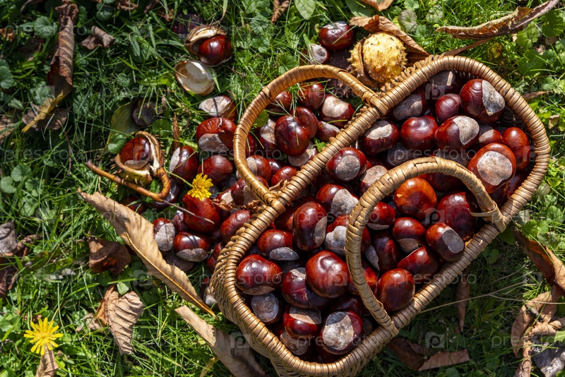 Собранные каштаны в плетеновой корзине на упавших листьях