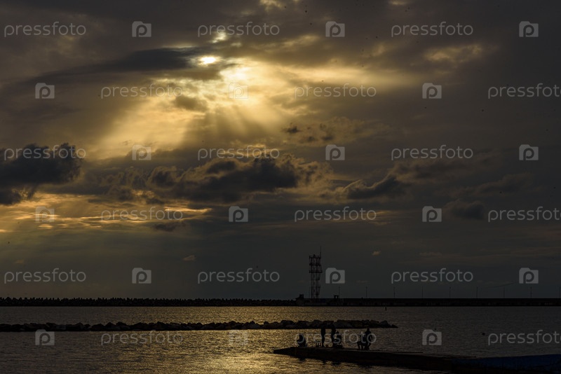 Вечерний морской пейзаж с солнечным светом, проникающим сквозь облака