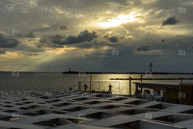 Спокойный закат солнца над океаном с силуэтами людей на пирсе