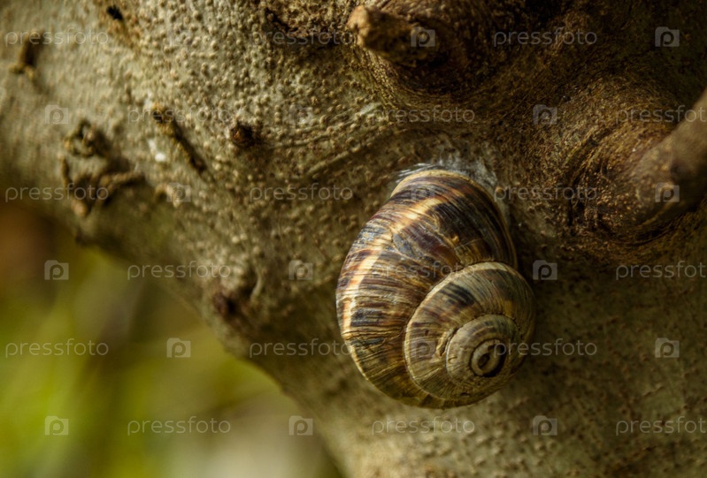 Близкий план улитки, взбирающейся на изогнутую ветвь дерева