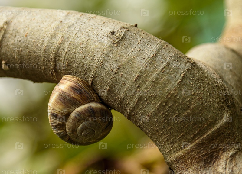 Ближайший снимок виноградного улитки, взбирающейся на изогнутую ветвь дерева