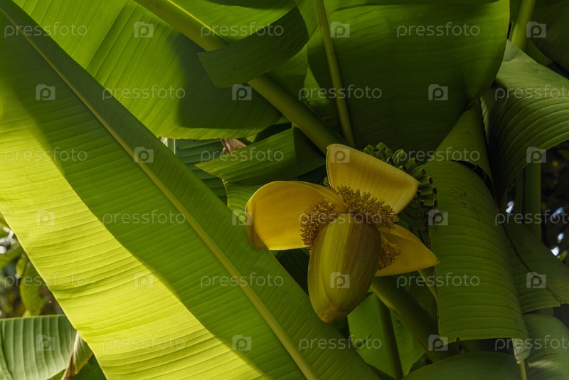 Ярко-желтый банановый цветок, распространенный среди пышных зеленых листьев