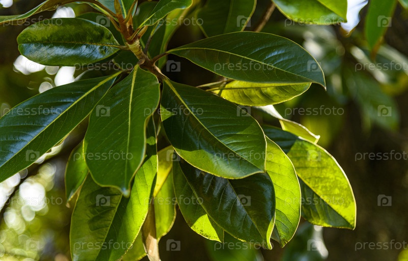 Ярко-зеленые листья магнолии блестят на солнце