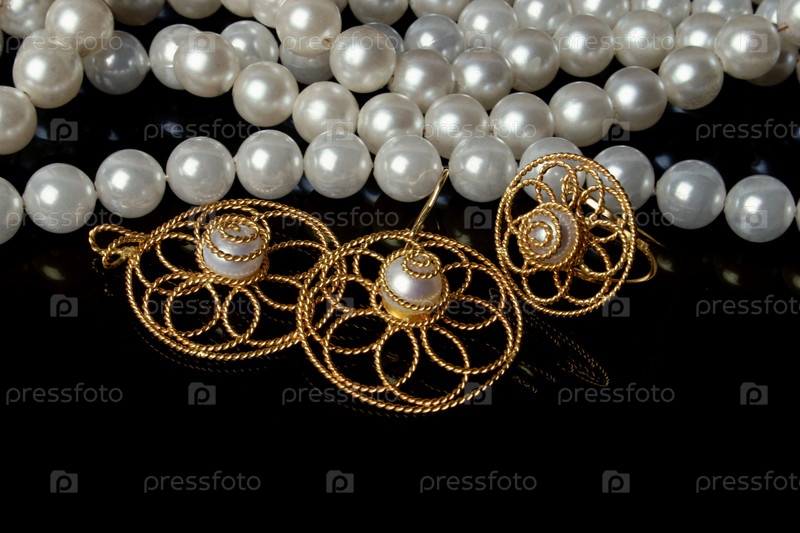 Жемчужное ожерелье, серьги и кольцо на черном фоне