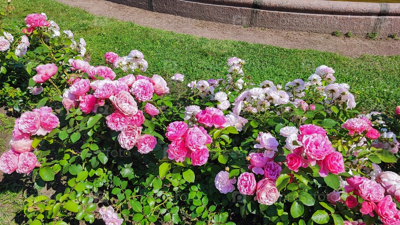 Цветение розовых и белых роз в пышном саду весной