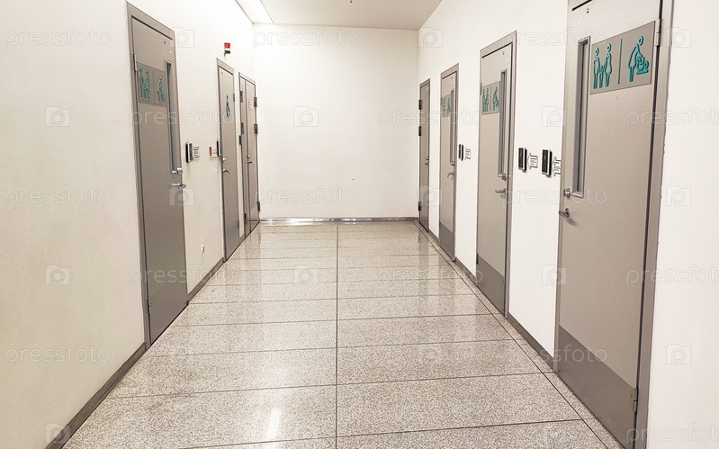 Коридор со многими закрытыми дверями в современном здании, туалет, комната матери и ребенка