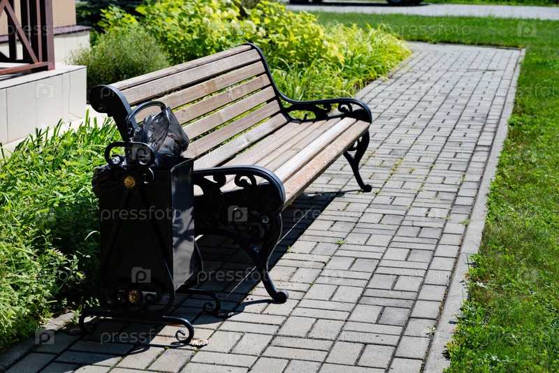 Деревянная скамейка с металлической рамой и рядом с ней мусорное ведро, расположенное на асфальтированной дорожке в парке со зелени