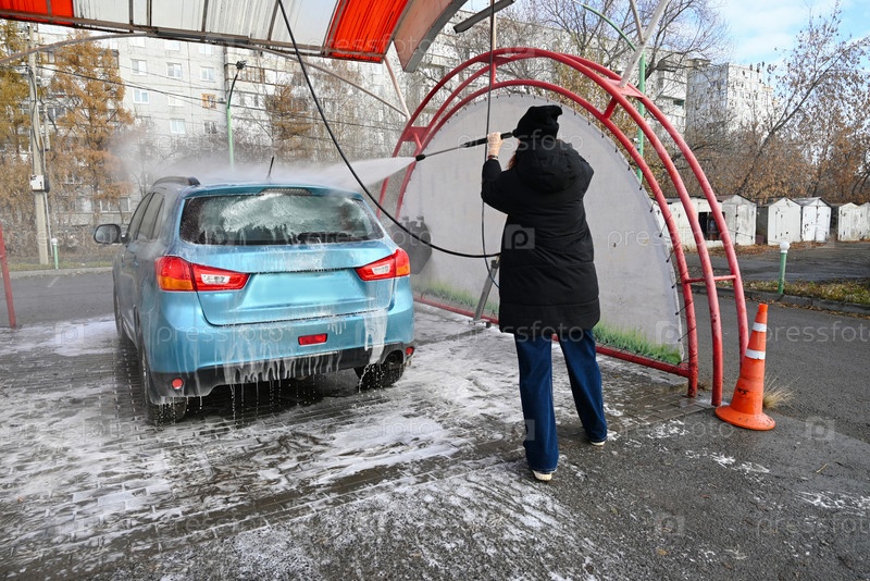 Женщина моет машину с помощью стиральной машины в городской автомойке самообслуживания на серый день
