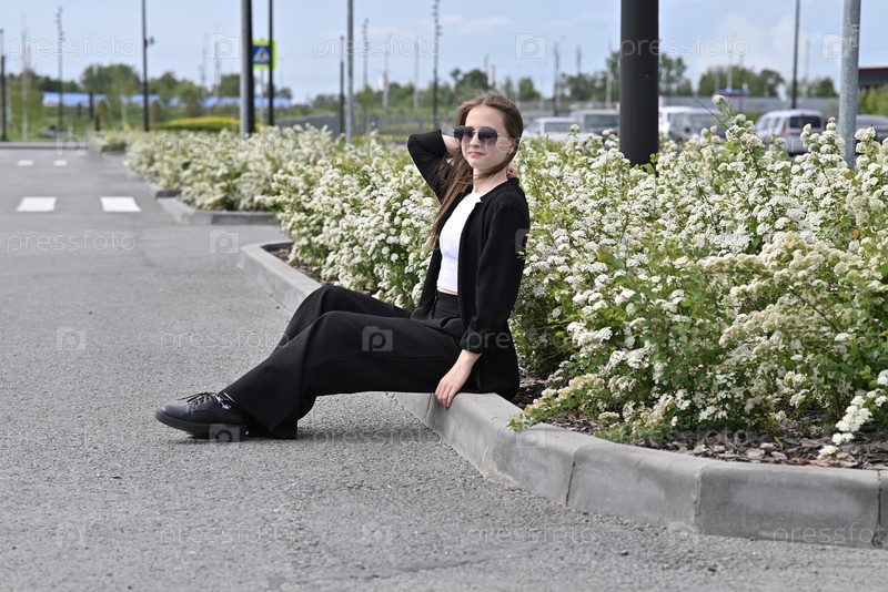 Молодая женщина в черном наряде, сидящая на тротуаре возле цветущих белых кустарников, с солнцезащитными очками, снаружи в солнечный день