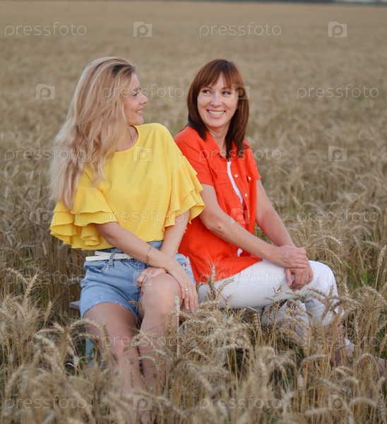Две женщины, сидящие вместе на поле золотой пшеницы во время заката солнца, делятся моментом дружбы и связи