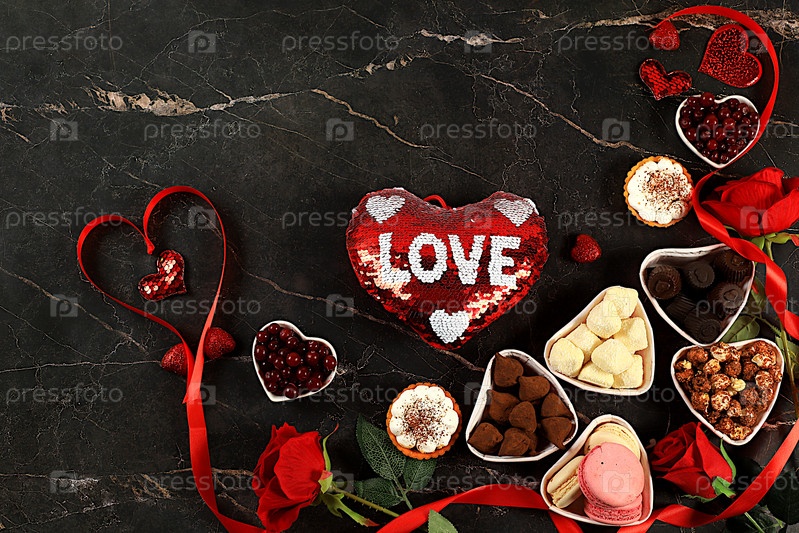 Еда на День святого Валентина или женский день, гурманские шоколады в форме сердца, сахарные клюквы, меренги и розовые цветы, поздравительная открытка, рекламный баннер или приглашение в магазин