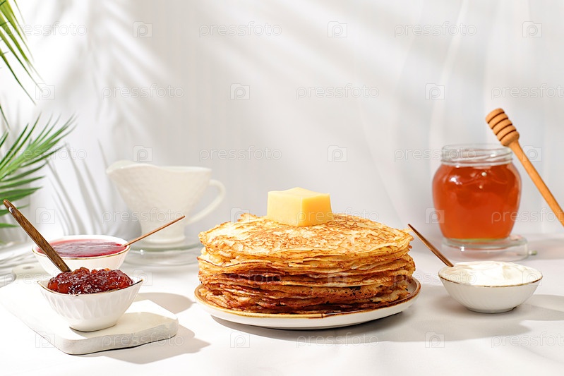 Вкусные российские блины с варенем, мягким творогом, консервированными продуктами и медом на мраморном столе.Здоровый завтрак из натуральных ингредиентов, Концепция Масленицы, Естественные продукты