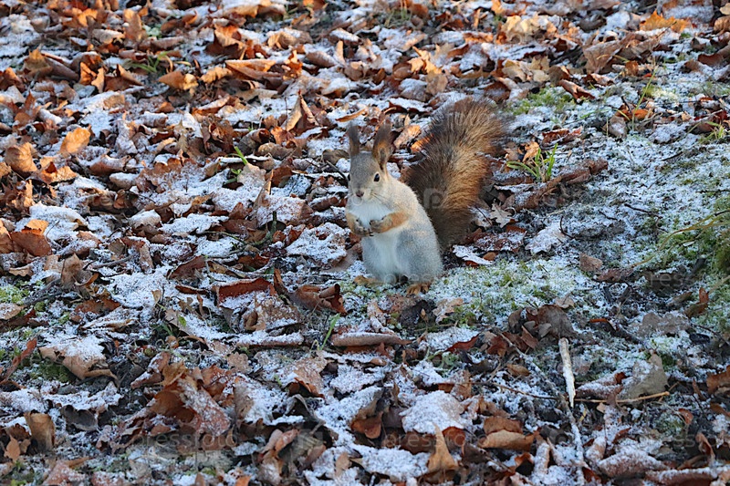 Забавная, милая белка ищет орехи на первом зимнем слое упавших листьев.Люди в парках помогают белкам пережить суровую зиму, оставляя лакомства из орехов и семян в лесу