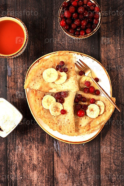 Вкусные российские блины с вареной конфетой, мягким творогом, бананами, клюквами и медом на мраморном столе.Здоровый завтрак из натуральных ингредиентов, Концепция Масленицы, Естественные продукты