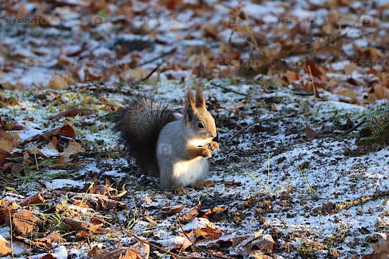 Люди в парках помогают белкам пережить суровый зимний холод, оставляя лакомства из орехов и семян в лесу