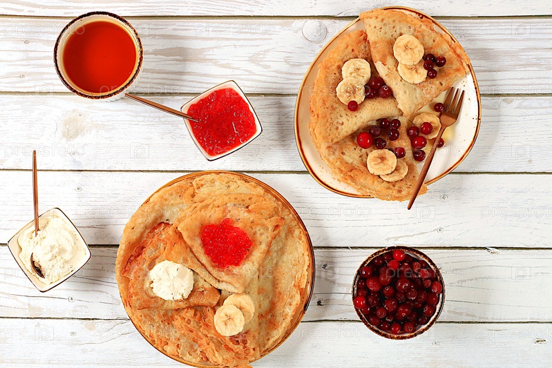 Вкусные российские блины с мягким сыром, бананами, красной икры и клюквами на кухонном столе.Здоровый завтрак из свежих ингредиентов вдохновленный Shrove