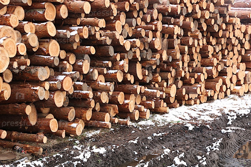 Древесные бревна складываются на улице. Промышленная дрова в России для отопления и строительства, экологически чистое топливо. Концепция охраны окружающей среды, тяжелый сельский труд