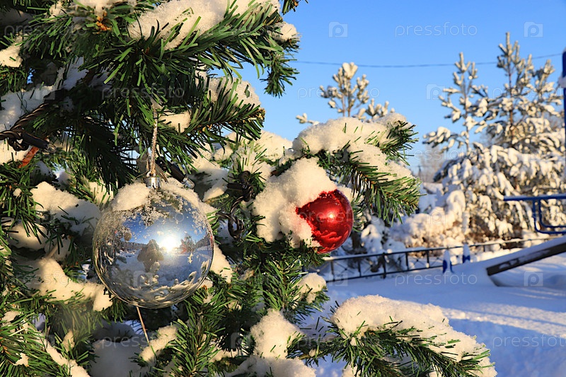 На улице находится покрытая снегом рождественская елка, украшенная на Новый год и Рождество. Праздничное красивое дерево с декорациями на фоне живых елей, покрытых снегом после снегопада