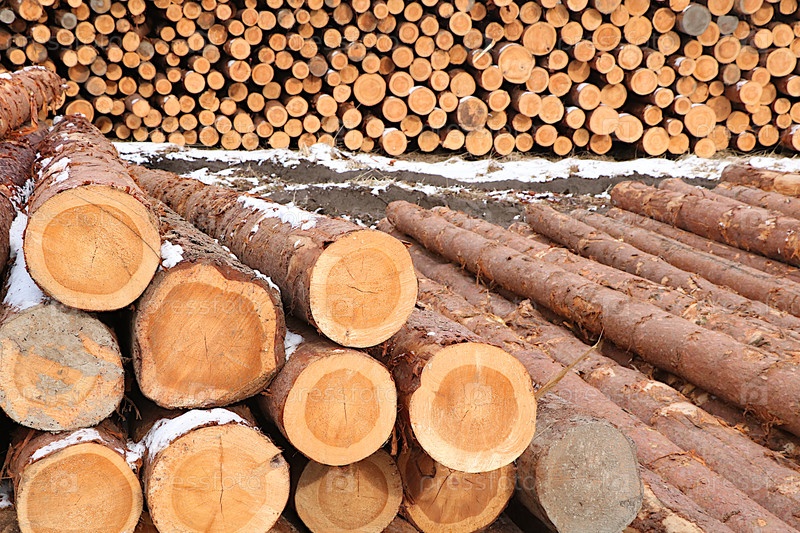 Древесные бревна складываются на улице. Промышленная дрова в России для отопления и строительства, экологически чистое топливо. Концепция охраны окружающей среды, тяжелый сельский труд