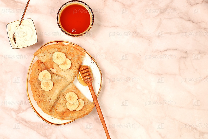 Вкусные российские блины с мягким сыром, бананами и медом на мраморном столе.Здоровый завтрак со свежими ингредиентами, вдохновленными Масленицей и традиционной русской кухней