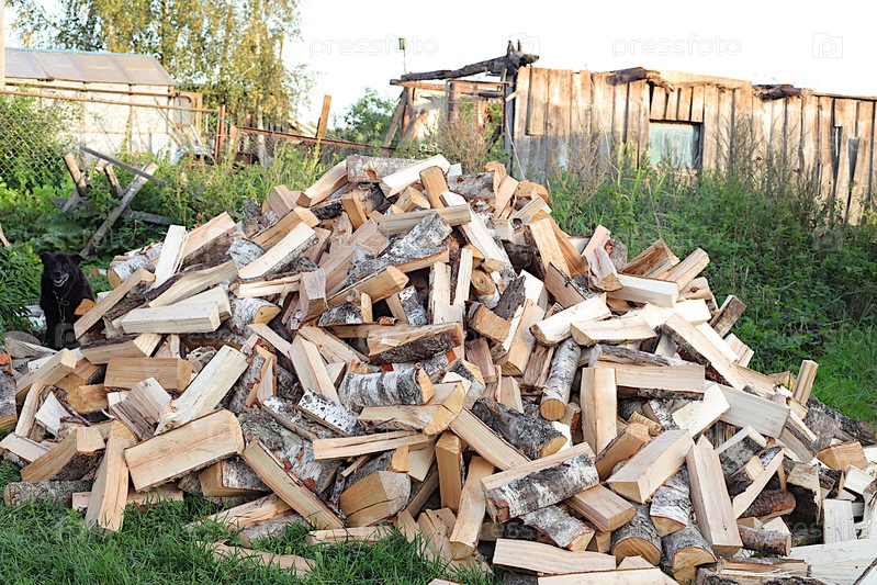 Снаружи стоит куча измельченной березовой древесины, охраняемой старой собакой среди разрушенного сарая.Приготовление дров для зимнего отопления в русской деревне, экологически чистое топливо