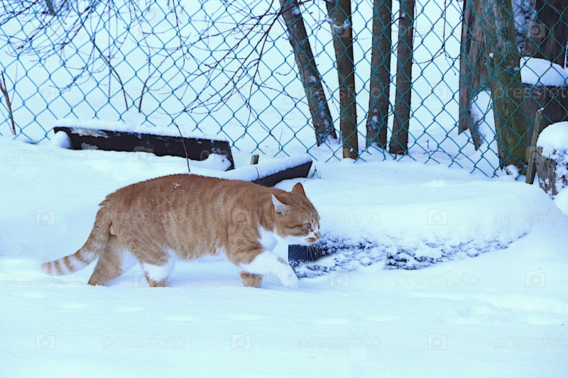 Забавный красный кот с плоскими ушами идет по тропинке через снежные дюны. Сильные зимние морозы не пугают сибирских кошек, которые не боятся холода. Понятие сострадания