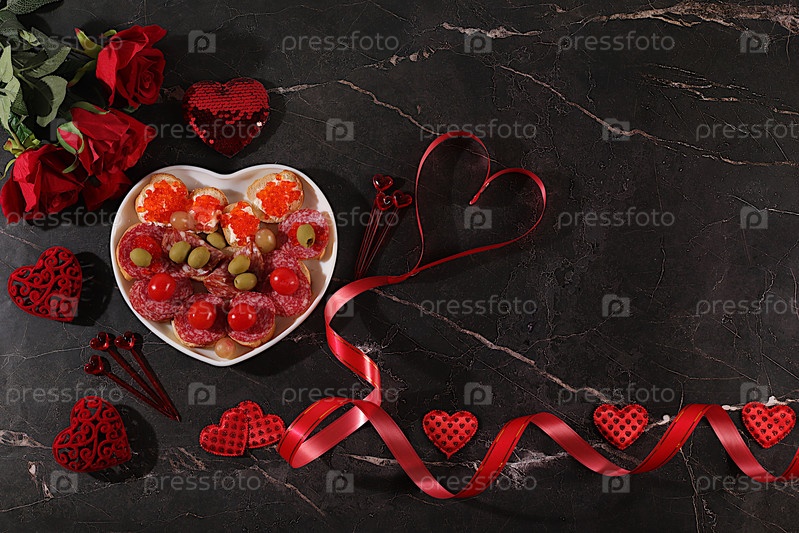 Удовольствие на День святого Валентина, сердце свежих каннапесов с салями, икры, сыра и винограда для буфета с розами, красное вино, красные сердца для праздничного стола, баннер для рекламы, приглашения в бар
