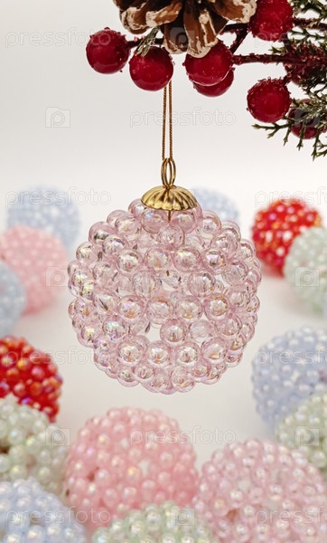 Элегантный рождественский шар ручной работы из розовых бусин, висящий на праздничной вечнозеленой ветке с красочными шарами на заднем плане